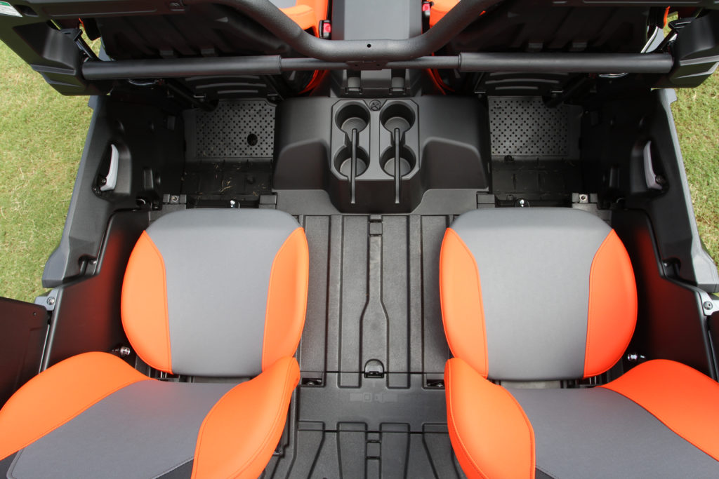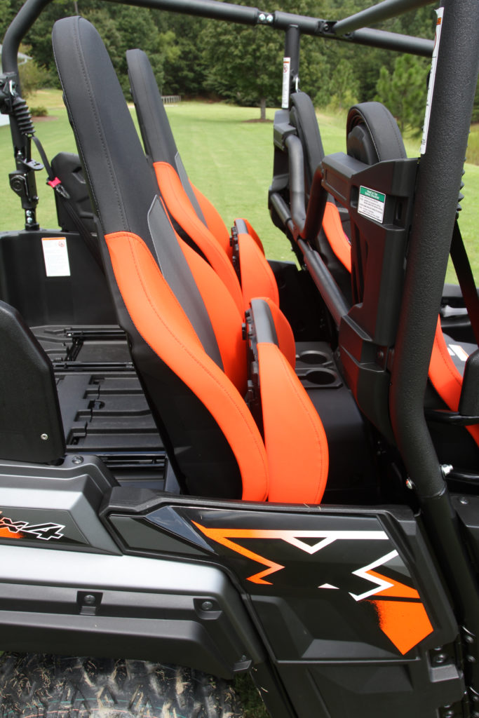 To get there the WX4 is built upon a very compact platform, especially for a four-seat vehicle. The wheelbase is just over 52-inches and the width is under 60-inches. To utilize these dimensions and still accommodate four passengers with equally plush bucket seats, the rear seats are positioned almost directly over the rear axle. The seats are also elevated and positioned atop what is traditionally the rear cargo box. Adding versatility to this arrangement, the seat bottoms can also flip up and the entire seat slides forward to create additional rear cargo box space.